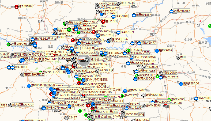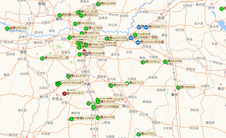 對狀態不同車輛一般有行駛,停駛,報警,無信號(如在地下停車場)等有不同顏色表示,如行駛是藍色,停駛是綠色,報警時是紅色,無信號時是黑色等等,讓企業對所屬車輛的狀態一目了然。