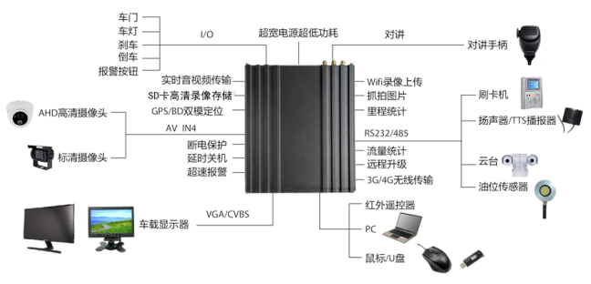 車載移動視頻監控終端集成了數字視音頻編碼模塊、視音頻存儲模塊、無線網絡傳輸模塊、報警信息處理模塊、北斗定位模塊,并提供了多種擴展,可實現高清晰視音頻錄像、無線網絡傳輸、報警信息上傳、車輛位置等功能。